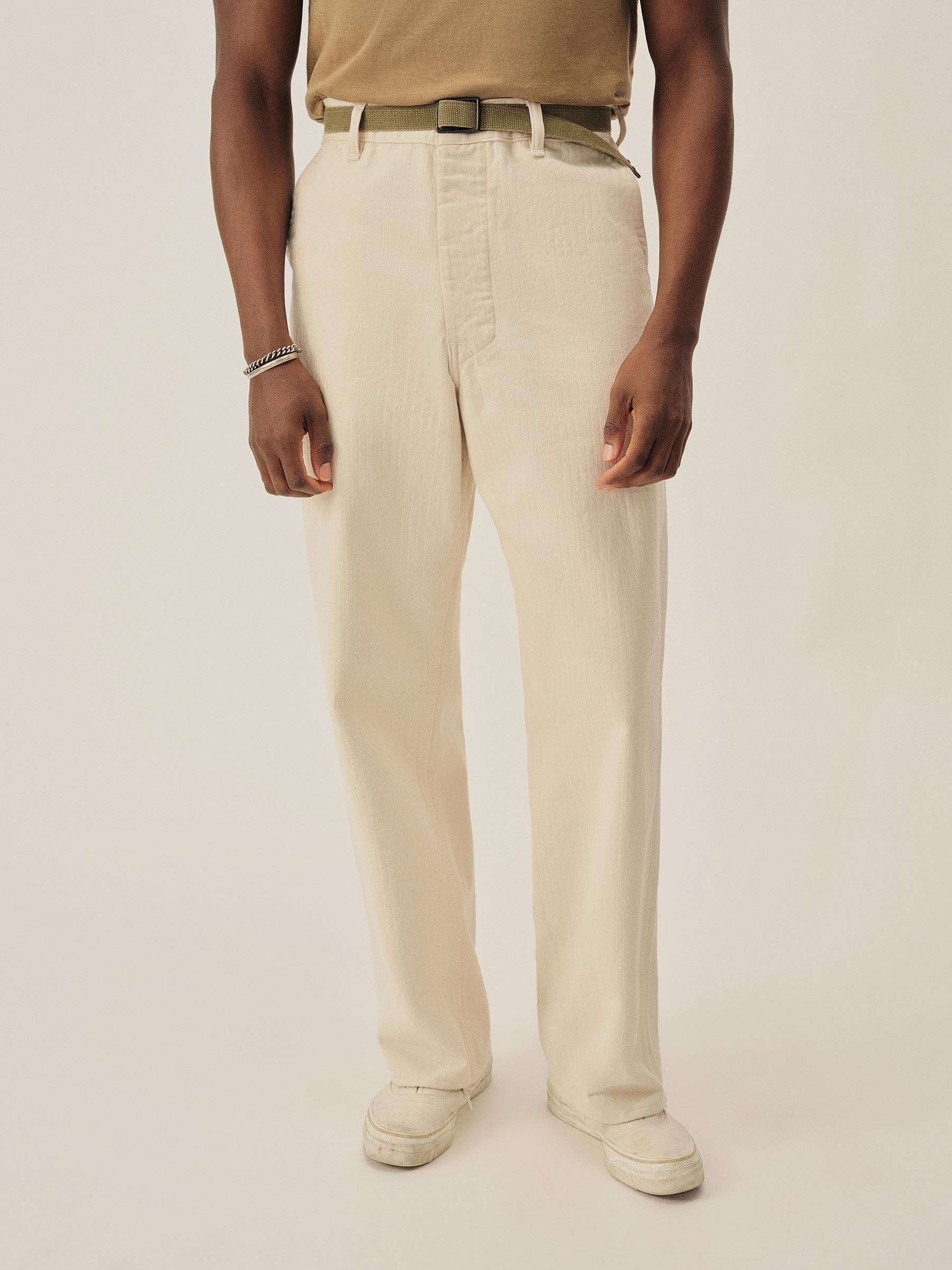 Based on 1940s USN dungarees, a work pant built from a yarn-dyed, 10 oz, 2×1 denim sourced from Collect Mill in Japan. Designed with stitch-through fatigue-style front pockets, patch back pockets, and a utilitarian construction throughout. Cut on the P-41 block for a historically grounded, archival fit.