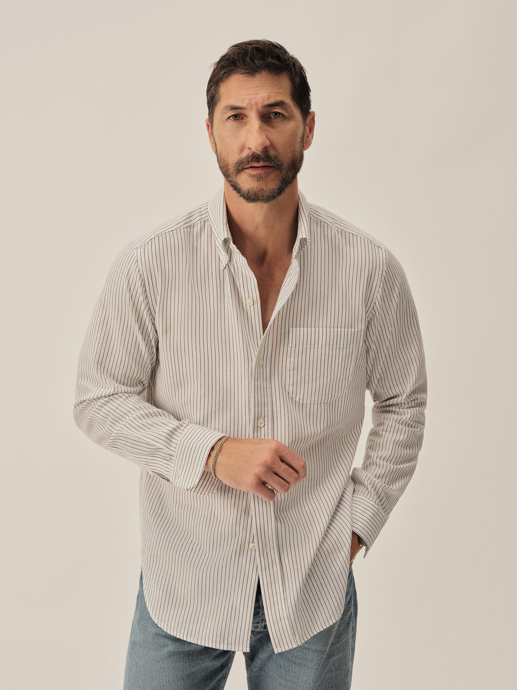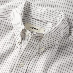 Classic fit button down collar shirt cut from a proprietary 3 oz blend of cotton and tencel. Details include mother of pearl buttons, a single scallop pocket, and a box pleat at the back. Constructed with clean finished seams. Garment washed for a lived-in look and feel.