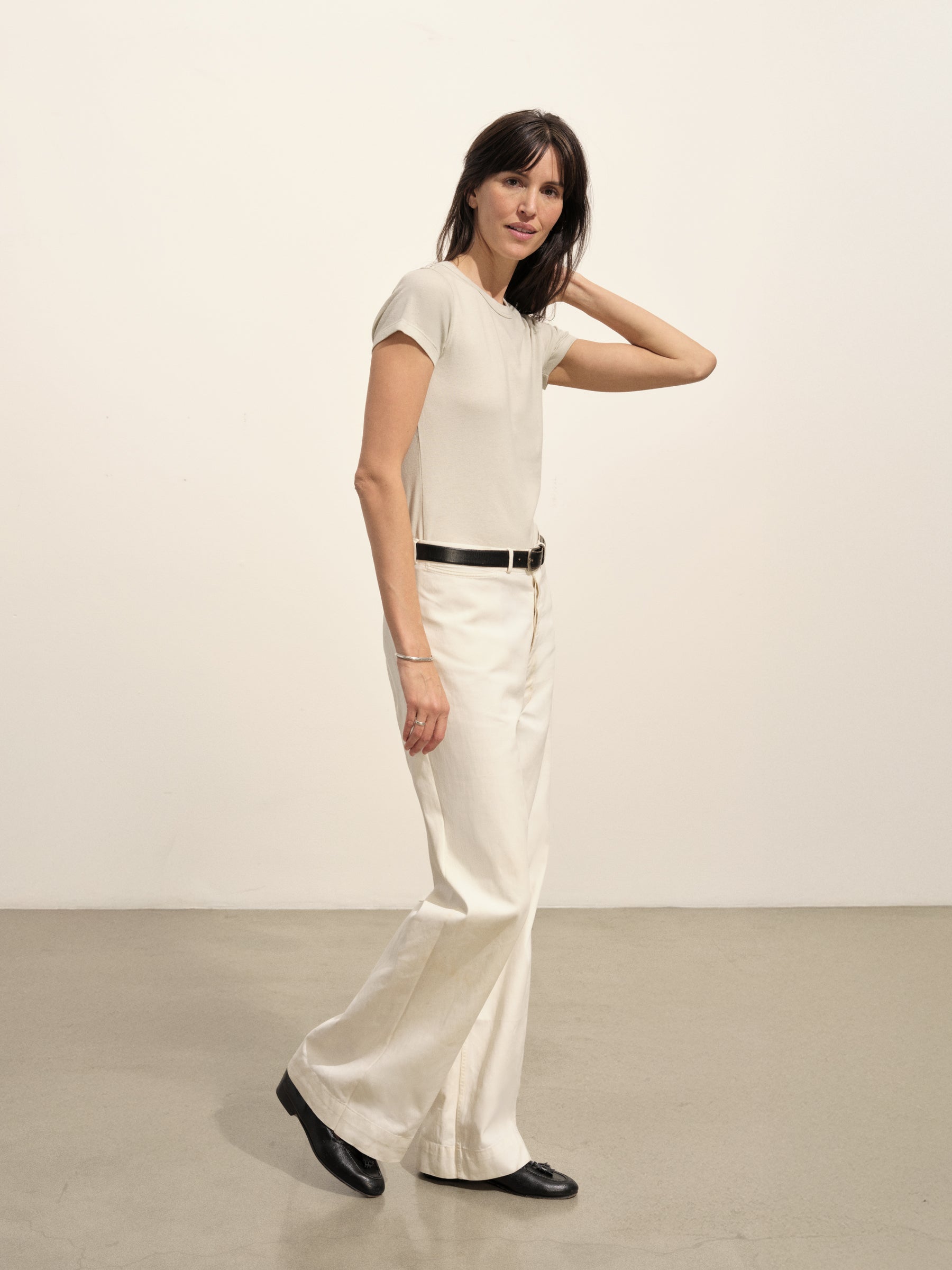 Slim fit crewneck tee cut from a supersoft 130 GSM blend of bamboo, cotton, and wool. Features a straight hem, a self bound neck, and raised armholes that hug the contours of the shoulders. Garment washed for a lived-in feel.