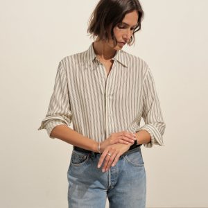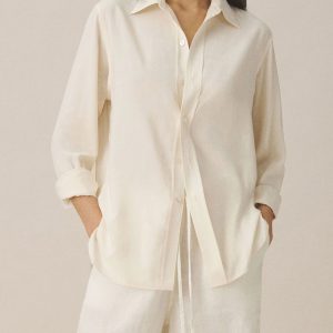 Oversized short-sleeve camp collar shirt with a cropped body, cut from a 100% linen weave. Featuring a low neckline, two front chest pockets, notched vents at sides, and a back yoke to box pleat. Finished with oversized mother of pearl buttons for a luxe, polished summer look. Garment washed for a lived-in look and feel.