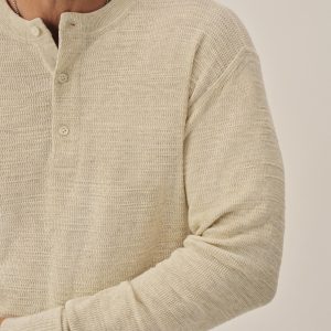 A standard fit, vintage-inspired thermal stitch henley crafted from slubby, yarn-dyed cotton. Featuring variegated rib finishes at the cuffs and bottom hem, and coverstitching along the seams. Finished with a three button shell closure.