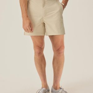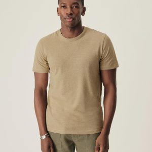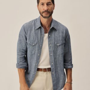 Classic fit short sleeve camp shirt cut from a 5.25 oz. yarn-dyed linen blend with a subtle luster and relaxed drape. Features a six-button placket with mother of pearl buttons, twin patch-and-flap chest pockets, straight hem, and a loop and button closure at the neck. Constructed with clean finished seams. Garment washed with enzymes for a lived-in feel.