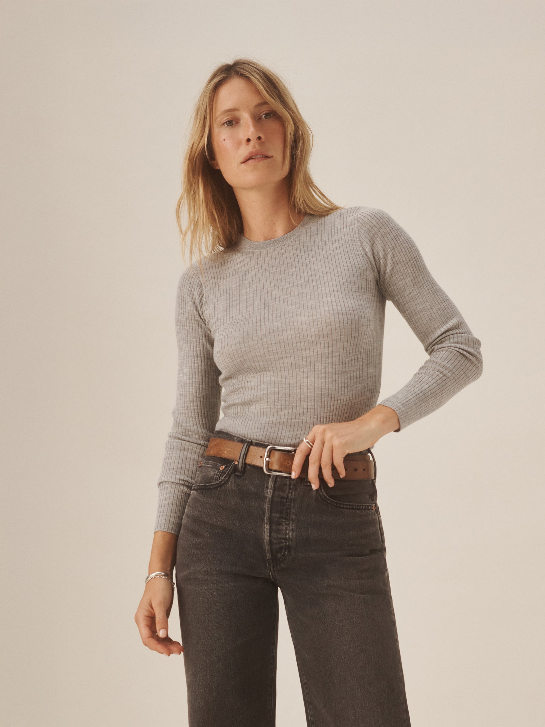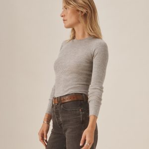 Slim fit crewneck sweater in a 24″” length, elevated in a 14 gauge variegated rib knit from a blend of merino wool, silk, and cashmere. Luxe, easy, and ideal for layering. Constructed with self-starting hem and sleeve trim and fashioning at the neckline and back shoulder for durability.