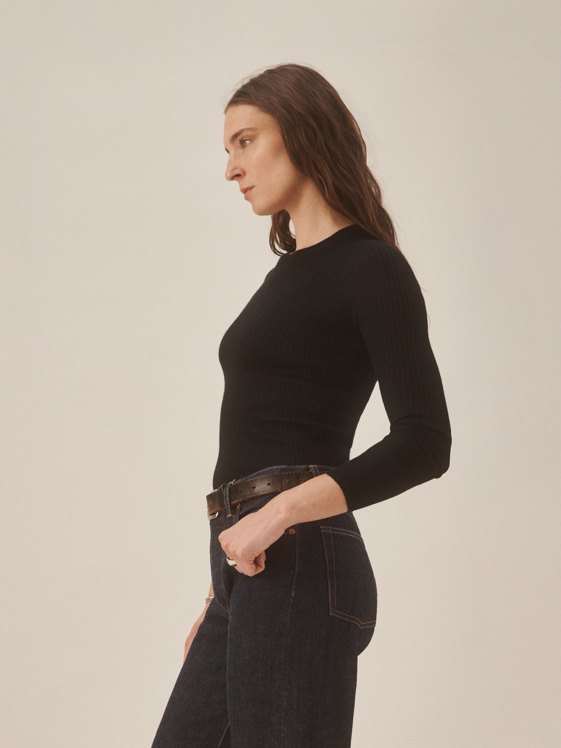 Slim fit crewneck sweater in a 24″” length, elevated in a 14 gauge variegated rib knit from a blend of merino wool, silk, and cashmere. Luxe, easy, and ideal for layering. Constructed with self-starting hem and sleeve trim and fashioning at the neckline and back shoulder for durability.
