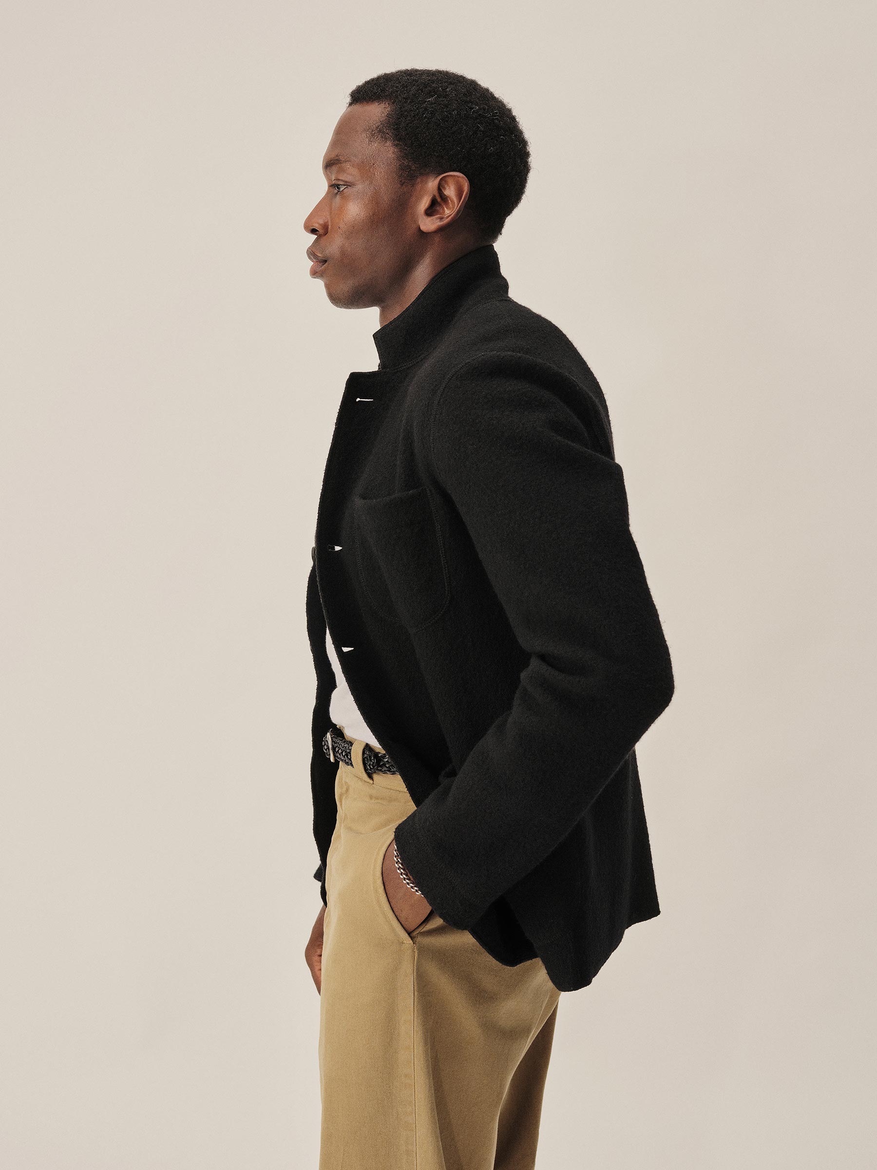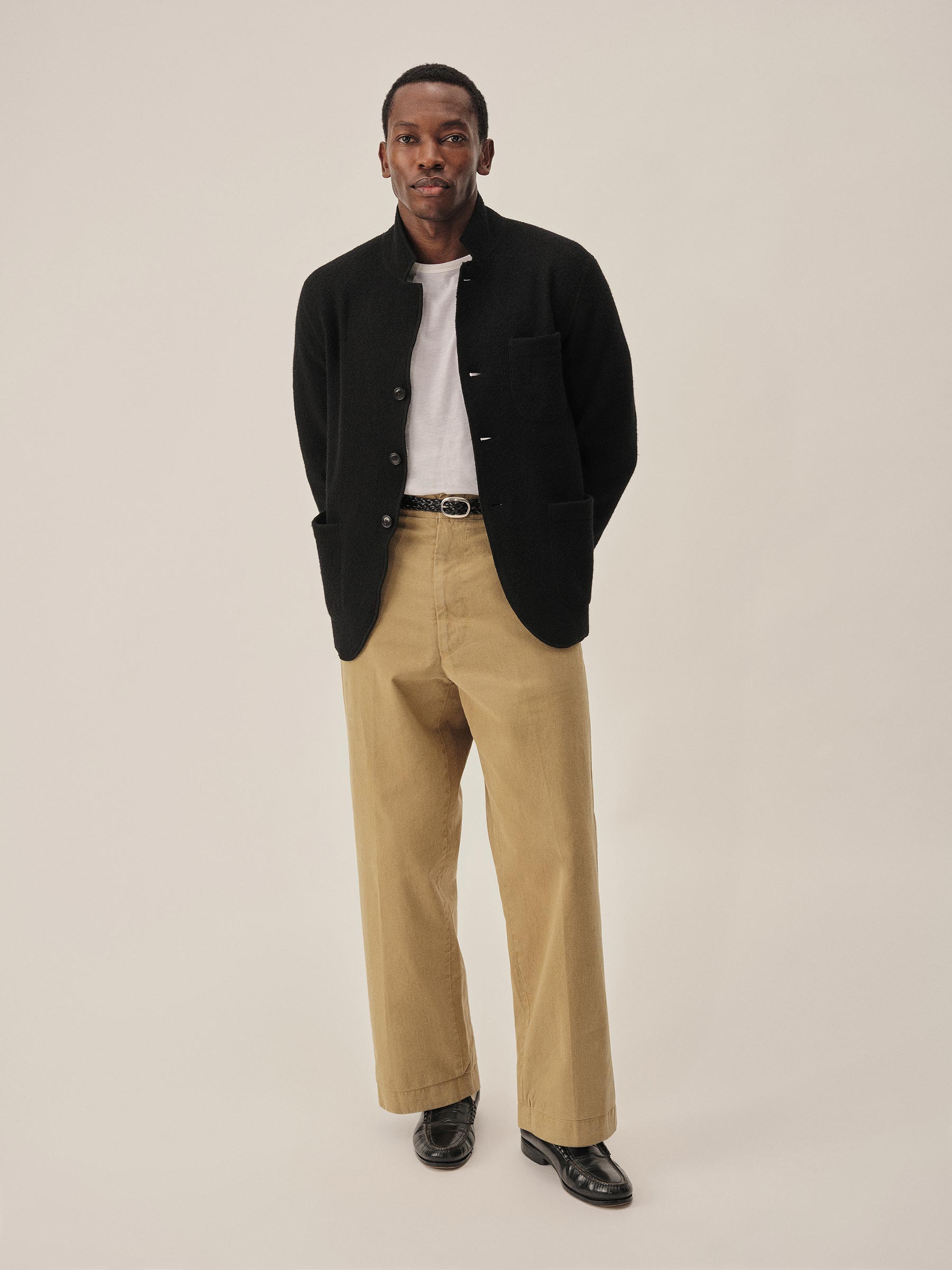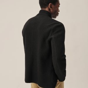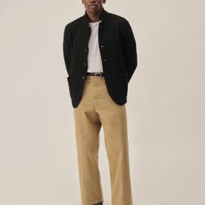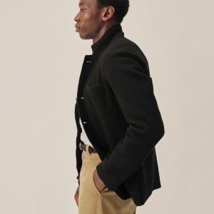 Classic fit chore coat with a slimmer cut through the arms and room in the torso for layering. This 340 GSM felted merino wool has been twice boiled for improved insulation and durability. Details include three patch pockets, real horn buttons, and a notch collar. Constructed with hand-sewn facings and cover-stitching throughout.