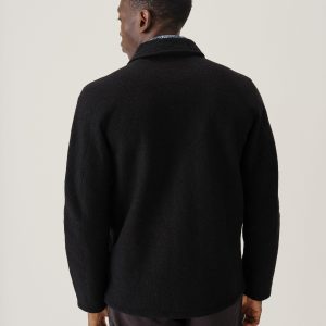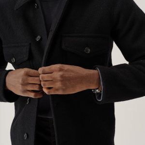 Classic fit field shirt in 340 GSM felted merino wool, twice boiled for improved insulation and durability. Details include patch-and-flap chest pockets and a button front closure. Constructed with hand-sewn facings and cover-stitching with flat seams for comfort.