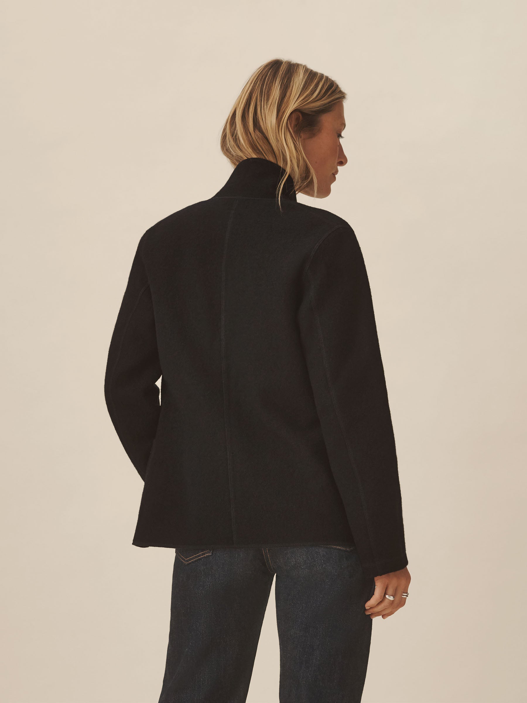 Classic fit chore coat with a slimmer cut through the arms and room in the torso for layering. This 340 GSM felted merino wool has been twice boiled for improved insulation and durability. Details include three patch pockets, horn buttons, and a notch collar. Constructed with hand-sewn facings and coverstitching throughout.
