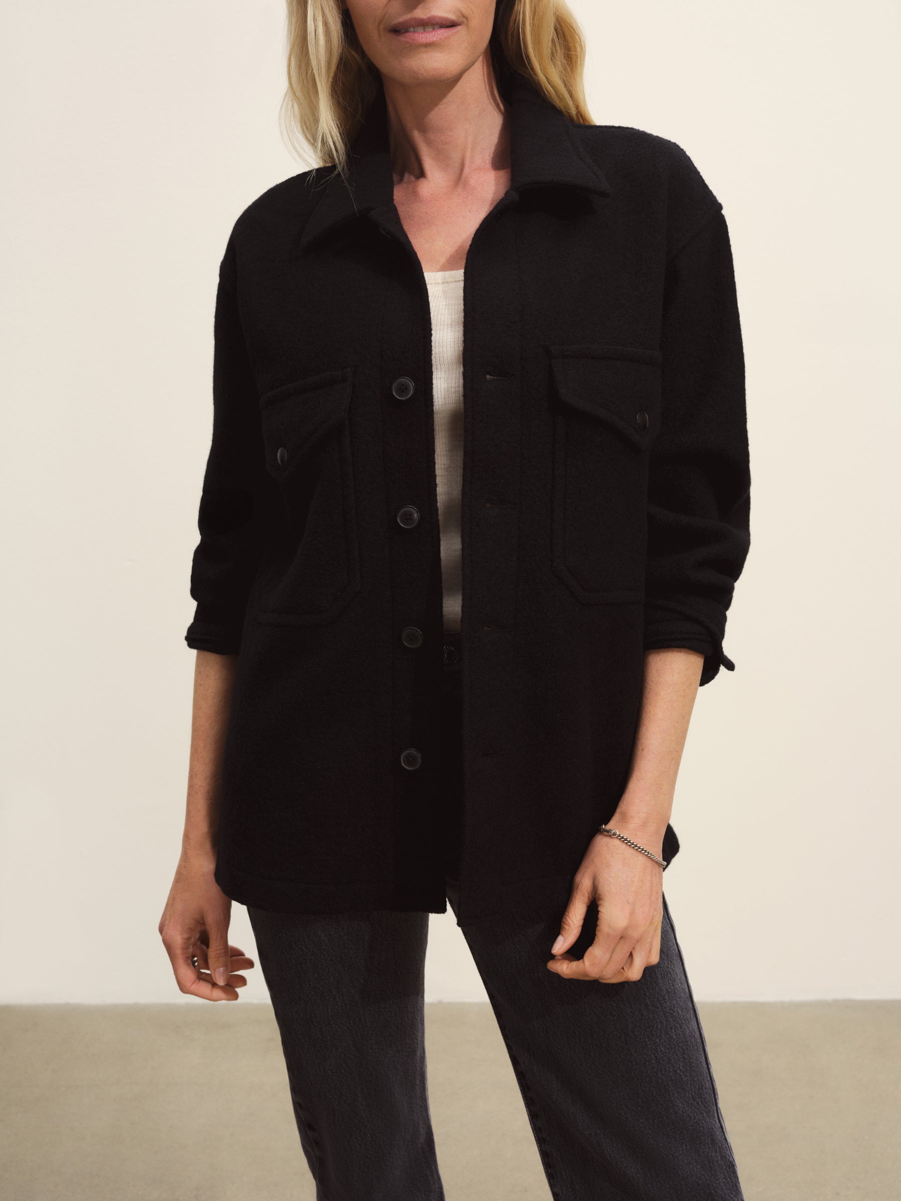 Relaxed field shirt with room to layer, cut from 340 GSM felted merino wool that’s been twice boiled for improved insulation. Details include patch-and-flap pockets and a straight, mid-length hem. Constructed with coverstitching throughout.