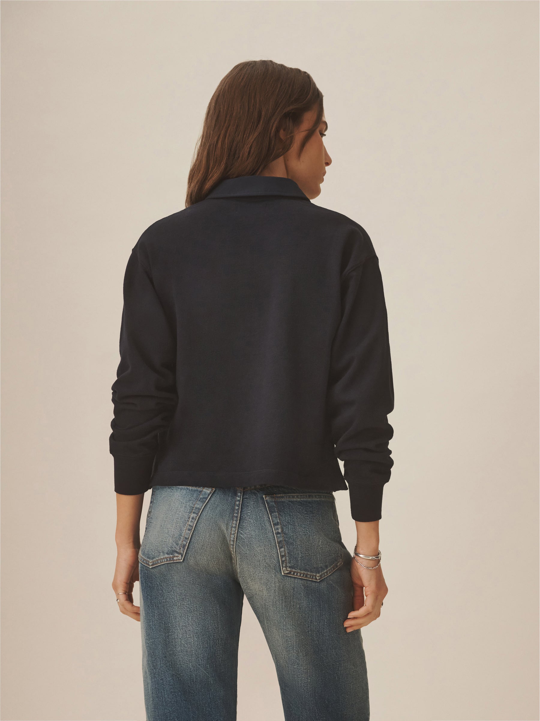 Inspired by the men’s Field-Spec Rugby, the women’s version is cut from 100% cotton in a dense slub jersey with a structured hand. Cut with a cropped, boxy fit and long sleeves, it’s designed with a woven twill collar and placket, tonal poly buttons at the center front, and herringbone-trimmed side slits.