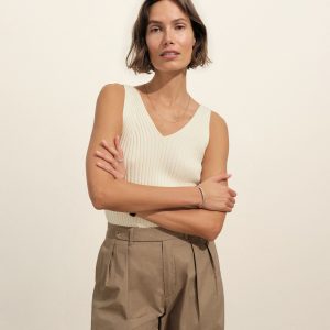 Slim-fit, vintage-inspired V-neck tank crafted from 100% Italian cotton yarn with a 3×3 deep rib structure. Designed with concealed chain threads and snaps beneath each shoulder to keep bra straps in place. Garment washed for a truly vintage, broken-in feel.