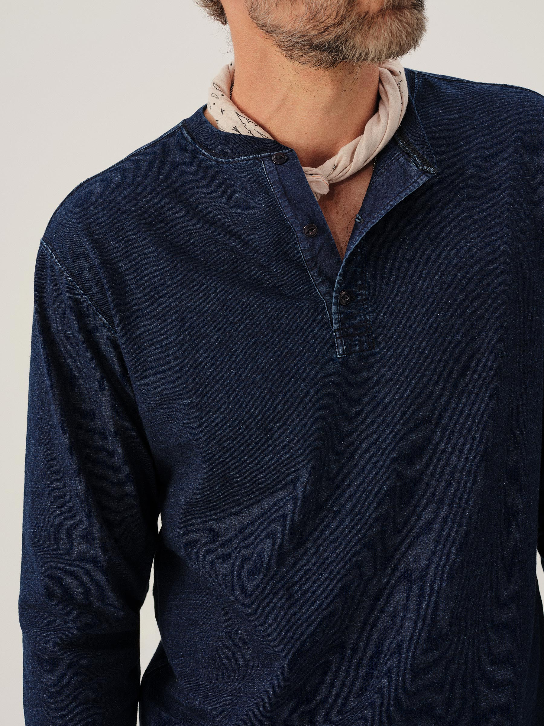 Classic fit long-sleeve henley, constructed with a durable, wrinkle-resistant three-button self-placket. Cut from a cotton hemp blend; each yarn is dipped in an indigo dye bath before knitting. Garment washed for a softer, lived-in feel.