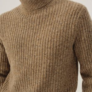 Classic fit long sleeve turtleneck sweater in light and breathable 9-gauge Italian yarn-dyed wool blend finely knit in a ribbed pattern with multicolor flecks reminiscent of Donegal tweeds. Constructed with fashioning at the shoulder and armhole and finished with a ribbed collar, cuffs, and hem. Lightly brushed for a softer hand.
