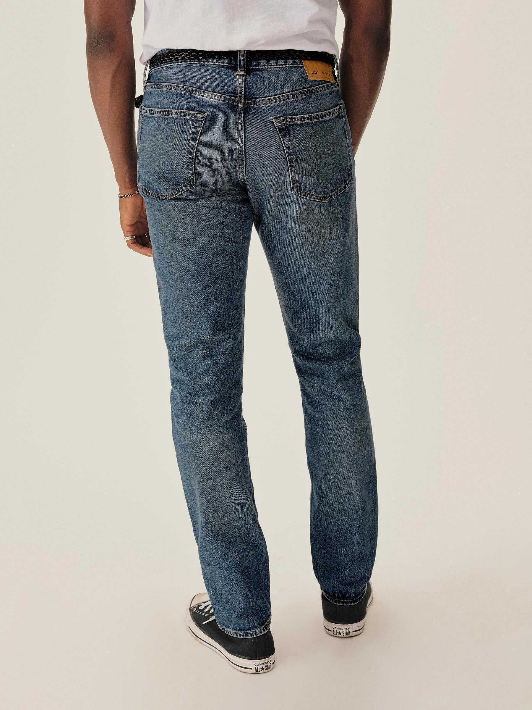 A classic 5-pocket jean in our Maverick Slim fit: Mid-rise with a clean, narrow fit through the thigh and leg. Button fly. Inspired by our favorite vintage jeans, this 14 oz denim from Japan-based Kaihara mills has a hint of stretch and an organic texture that develops more character with every wear. Garment rinsed for a lived-in feel. Details include copper rivets and a metal tack button fly.