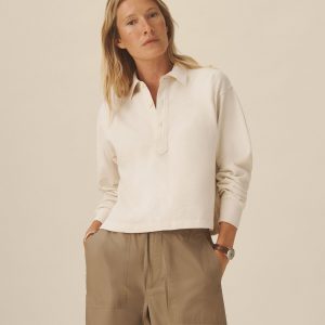 A slim henley crafted from a crepe wool-cotton blend yarn with natural texture and breathability. Designed with a flattering crew-meets-henley neckline, it’s constructed with a delicate pointelle drop-needle stitch throughout the body, functional mother-of-pearl shell buttons, and rib finishes at the cuffs and hem.