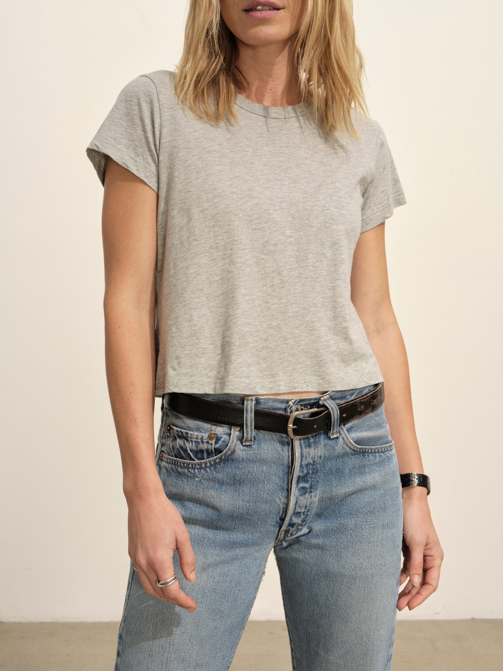 Boxy short sleeve crewneck tee with a straight hem. Cut from 120 GSM Supima cotton. Constructed with rib neck binding and double-needle cover-stitching at the hem. Garment washed for a lived-in feel.