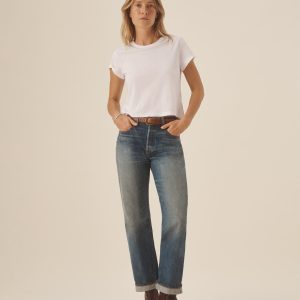Boxy short sleeve crewneck tee with a straight hem. Cut from 120 GSM Supima cotton. Constructed with rib neck binding and double-needle cover-stitching at the hem. Garment washed for a lived-in feel.