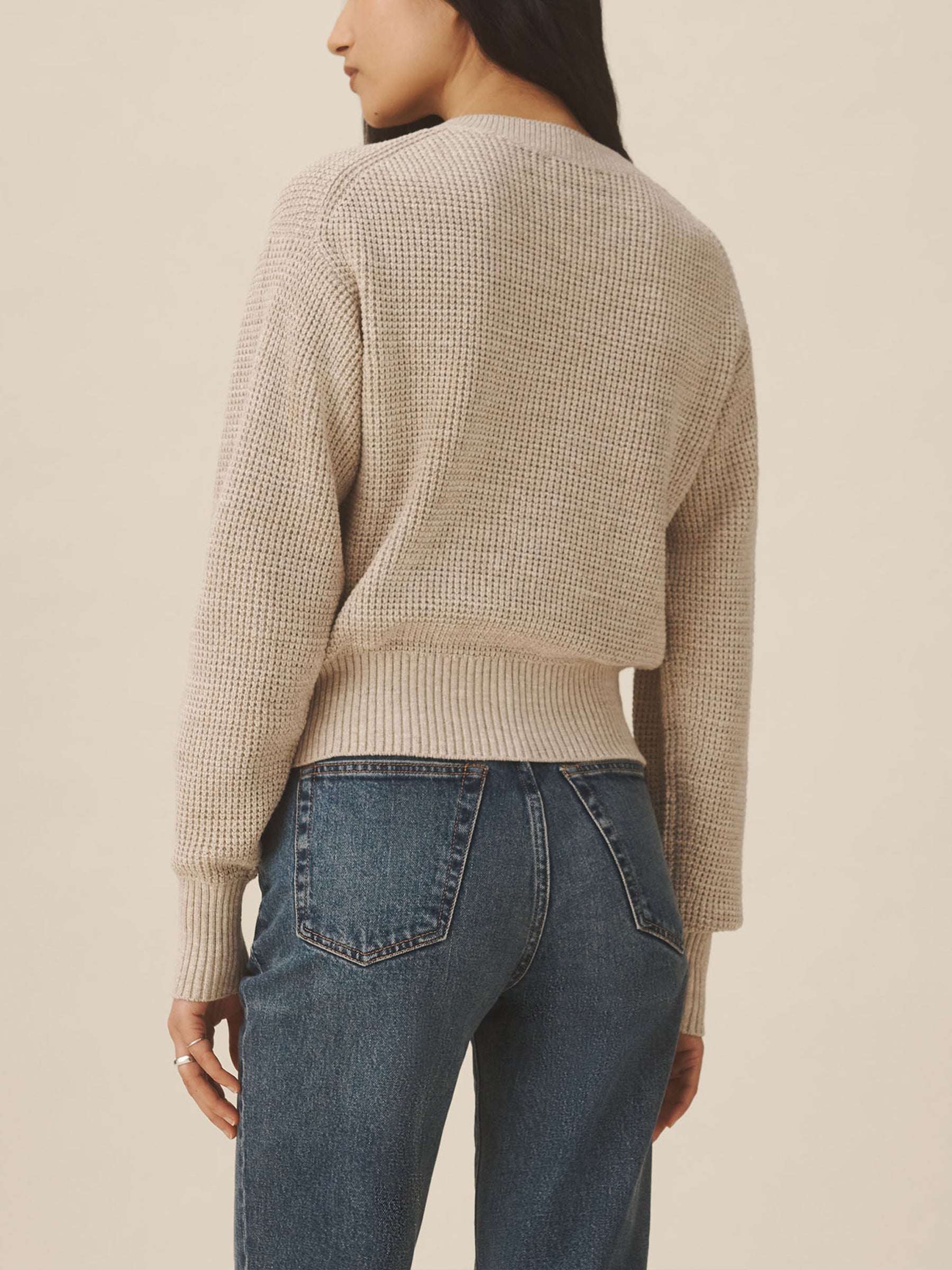 1960s inspired crewneck sweater with an easy, slim fit. Crafted from 7-gauge waffle knit yarn-dyed cotton with a light slub texture, featuring fashioning at the neck and drop-back shoulders as a nod to mid-century.