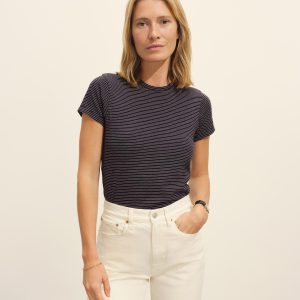 Slim fit crewneck tee cut from lightweight 180 GSM cotton jersey with a vintage-inspired yarn-dyed feeder stripe. Constructed with a durable rib stitch collar and double-needle cover stitch hem. Garment washed for a softer, lived-in feel.