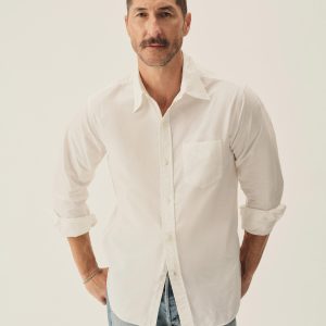 Classic fit button down collar shirt cut from a featherlight 3 oz cotton poplin. Details include mother of pearl buttons, a single scallop pocket, and a box pleat at the back. Constructed with clean finished seams. Garment washed for a lived-in look and feel.