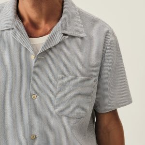 A light, airy seersucker camp shirt cut in a boxy fit with a straight hem. Features a one pocket construction and Mother of Pearl buttons.