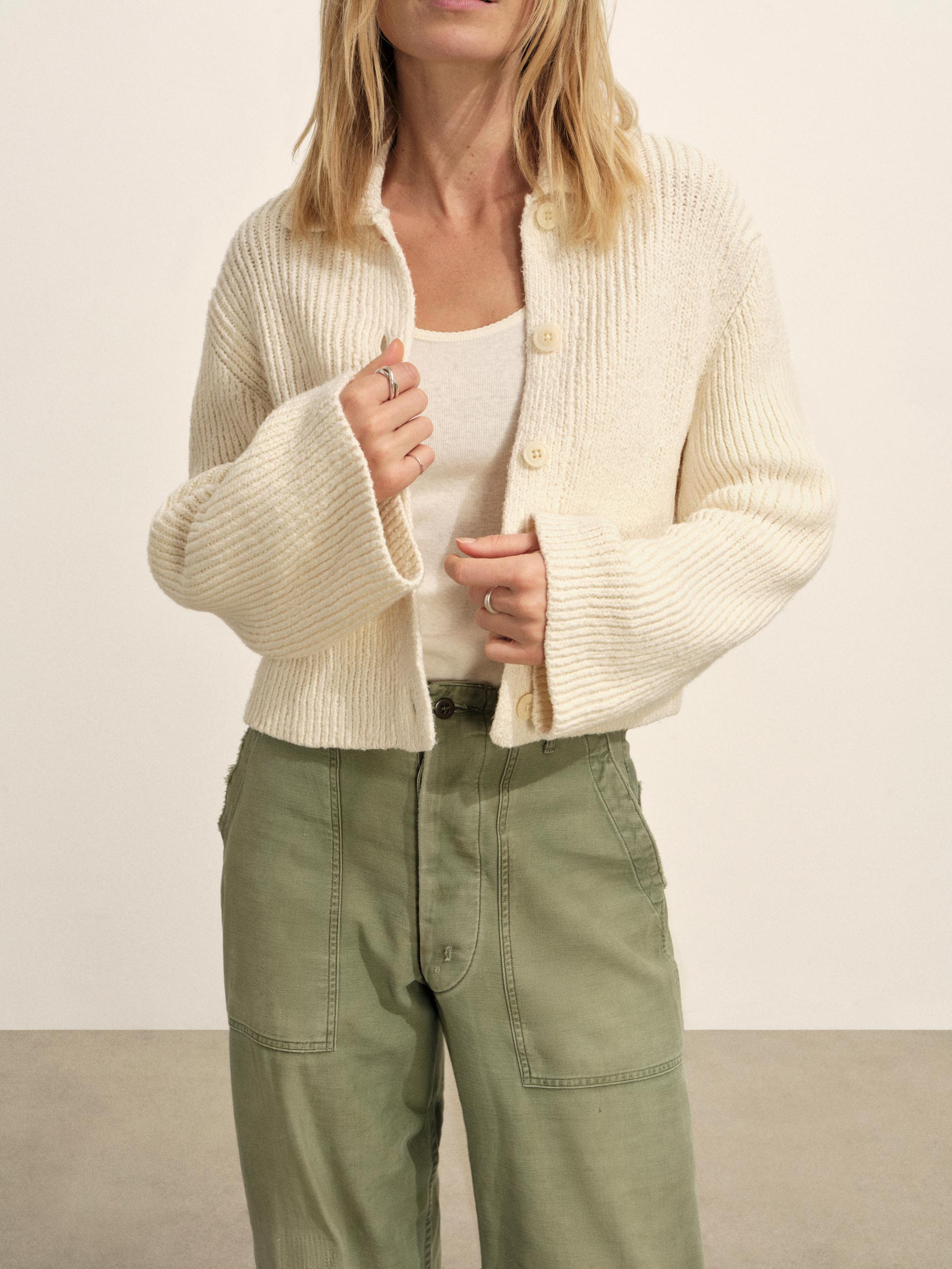 Relaxed, rib-stitched collared cardigan made from a lofty 5 guage cotton. Garment washed for a lived in, vintage feel and completed with corozo buttons and an easy, slightly laid back silhouette.