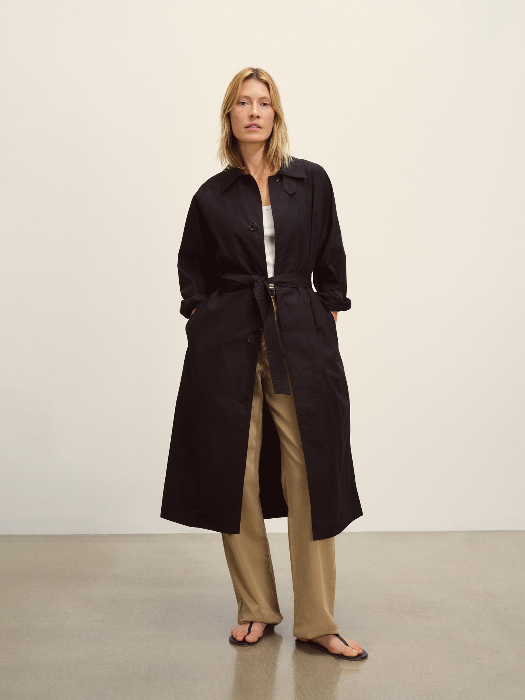 Relaxed, vintage-inspired trench coat cut from 5.7 oz. yarn-dyed cotton/poly twill weather cloth with a DWR finish. Features welt pockets, raglan sleeves, and a deep back vent. Details include a collar tab, button and tab cuffs, and a removable belt with leather buckle for cinching the waist. Size down for a more fitted silhouette.