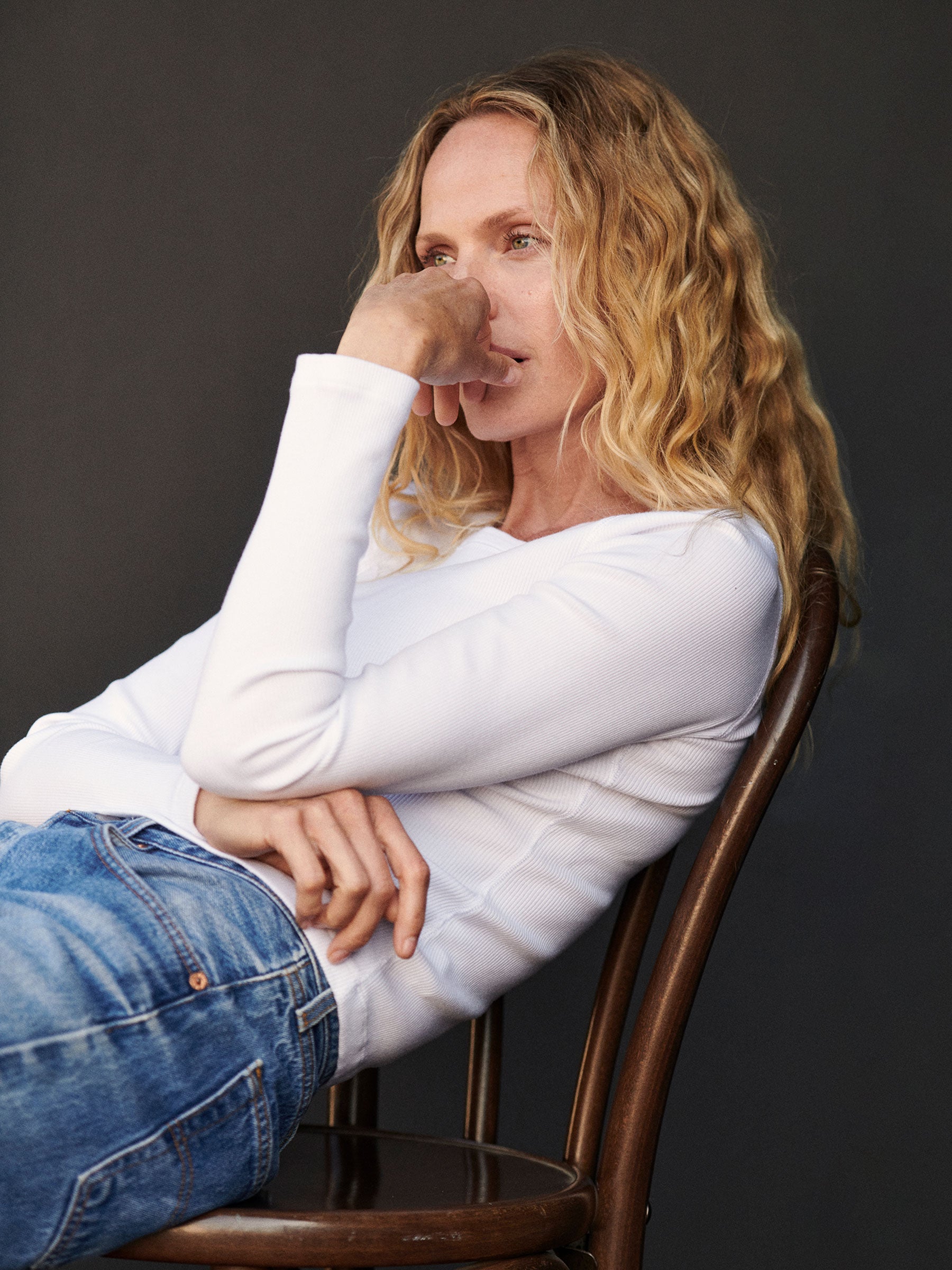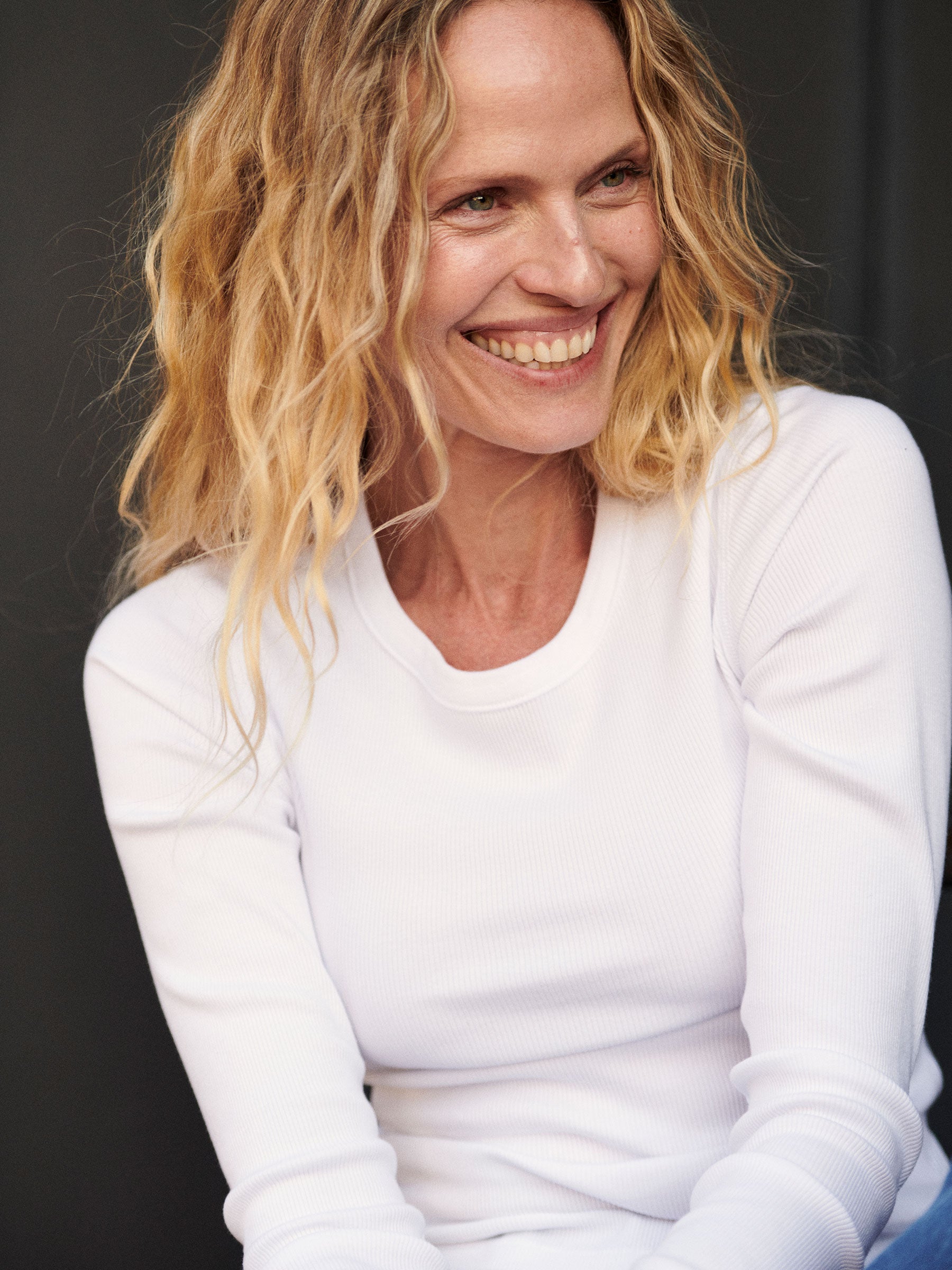 Slim fit ribbed long sleeve tee cut from 295 GSM stretch cotton that holds its shape. 2×2 rib structure—two rows of rib stitch, two rows of jersey stitch—is offset by contrast 1×1 rib at the neck. Constructed with coverstitching throughout and flatlock stitching at the side seams. Garment washed for a lived-in feel.