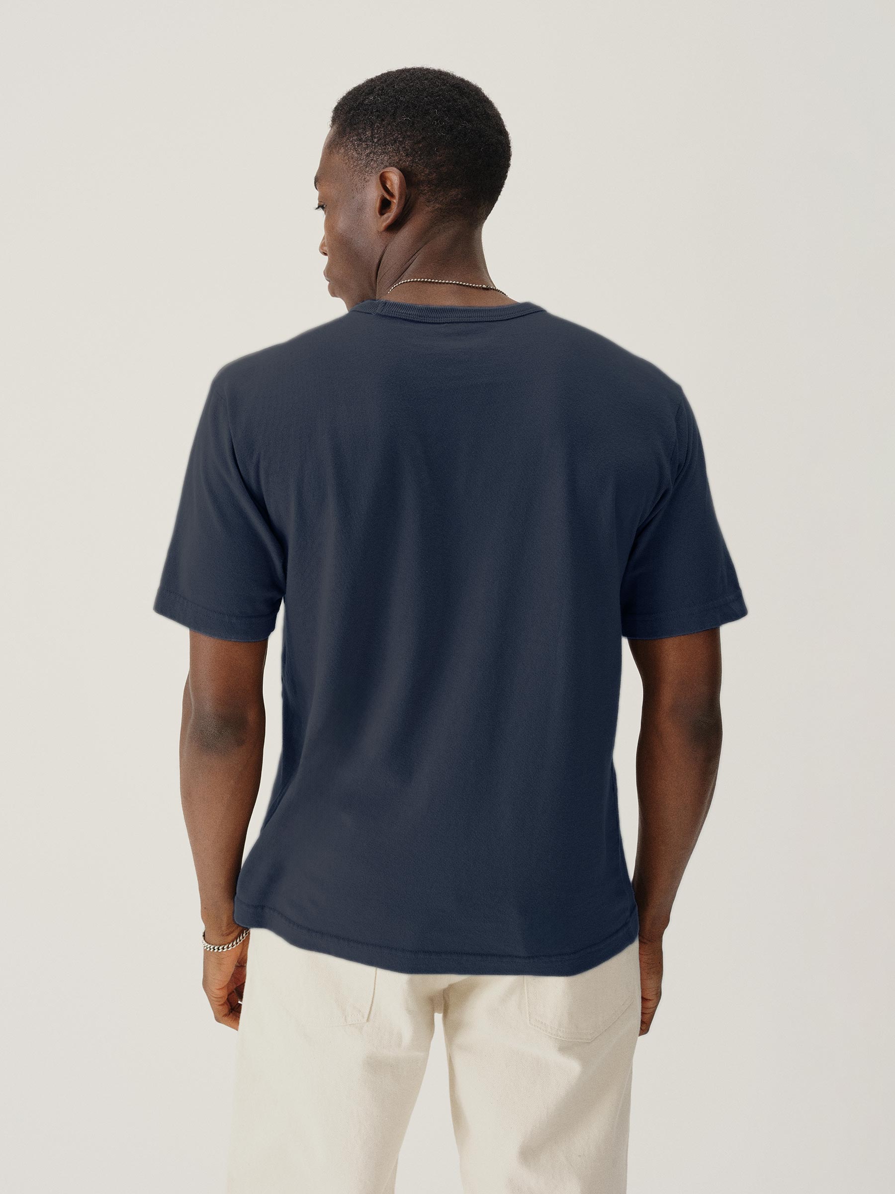 Cut from a midweight 200 GSM USA-grown cotton, developed, milled, and sewn at BM Knitting Mills in Mohnton, PA. This 90s-inspired boxy crewneck tee has a straight hemline, longer sleeves that hit lower on the bicep, and a wide ribbed collar. Bound neck and screen-printed label for comfort, constructed with a split-needle cover stitch at shoulders and armholes. Double-washed for a soft, smooth texture and consistent fit.