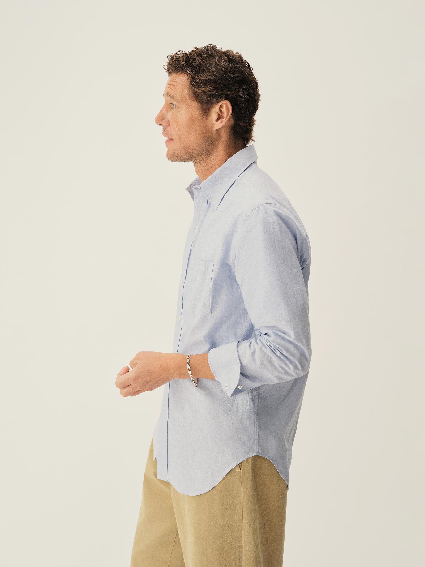 Slim fit long sleeve button-up cut from 4 oz. washed cotton. Details include a button placket, a single spade pocket at the chest, and a box pleat at the back yoke. Constructed with single needle topstitch detailing with double needle stitching at the collar and cuffs.